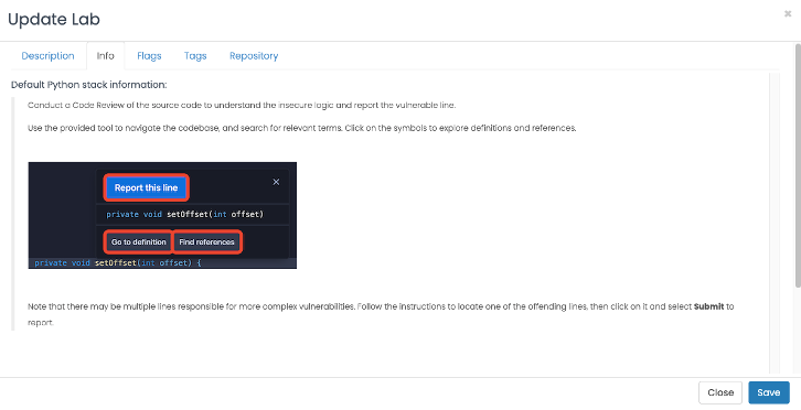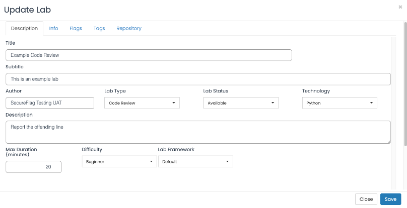 After you have created the code, you’ll need to define the lab metadata in the SecureFlag platform to complete your custom lab setup.