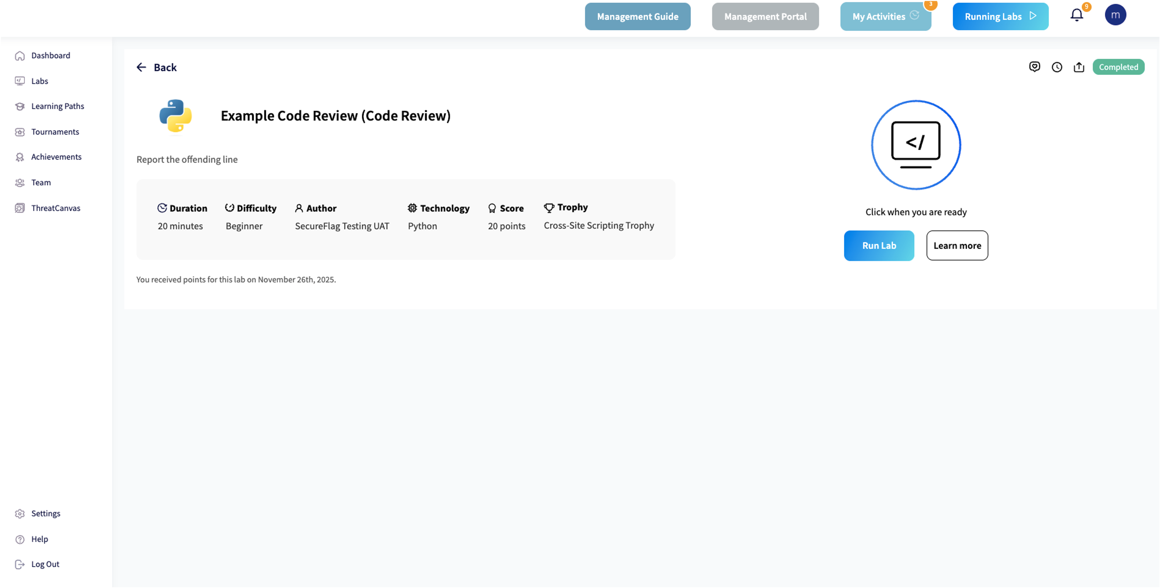 Custom Labs lets you build tailored Code Review labs in just a few clicks, using your own demonstrative code or snippets. They help challenge developers with vulnerabilities that reflect the technologies and patterns they use every day.