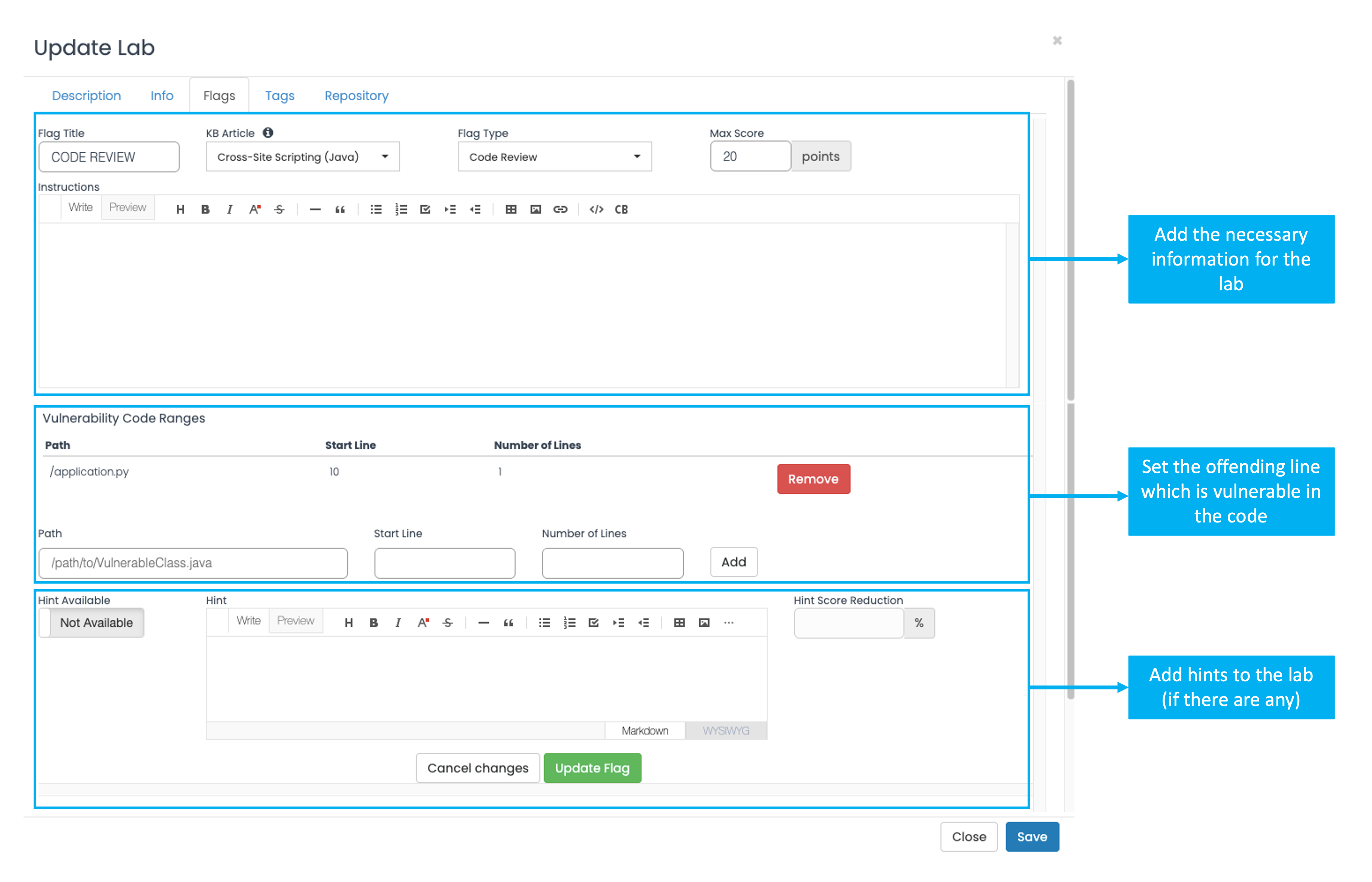 In the Flags tab, you can define the flag title, select the Knowledge Base article related to your lab, set the maximum score, and provide the lab instructions.