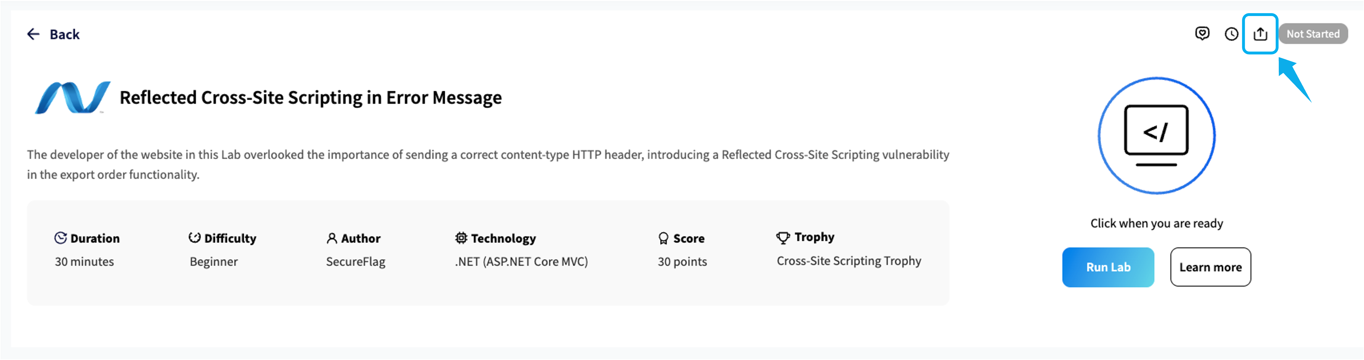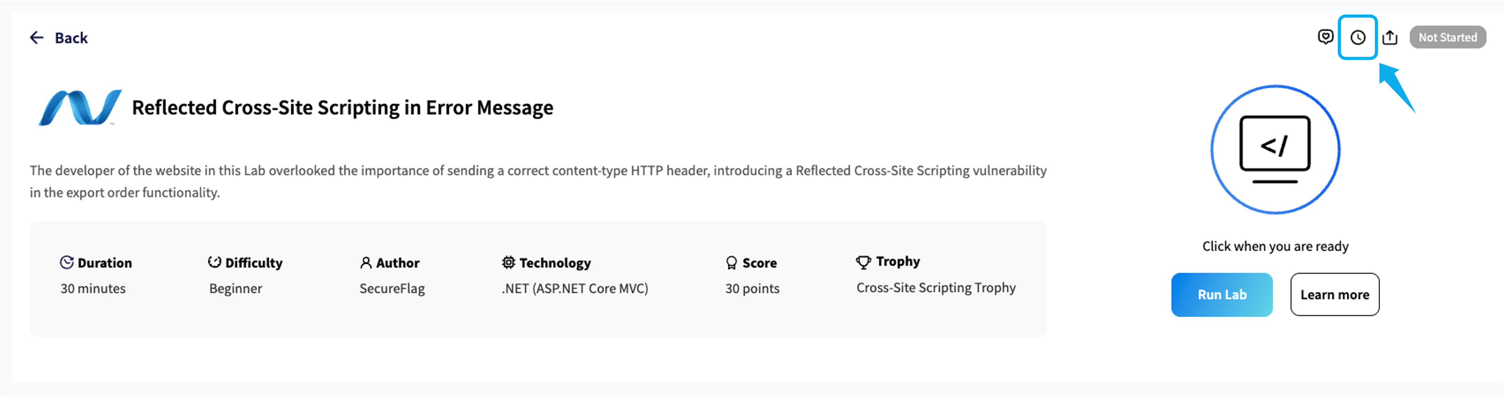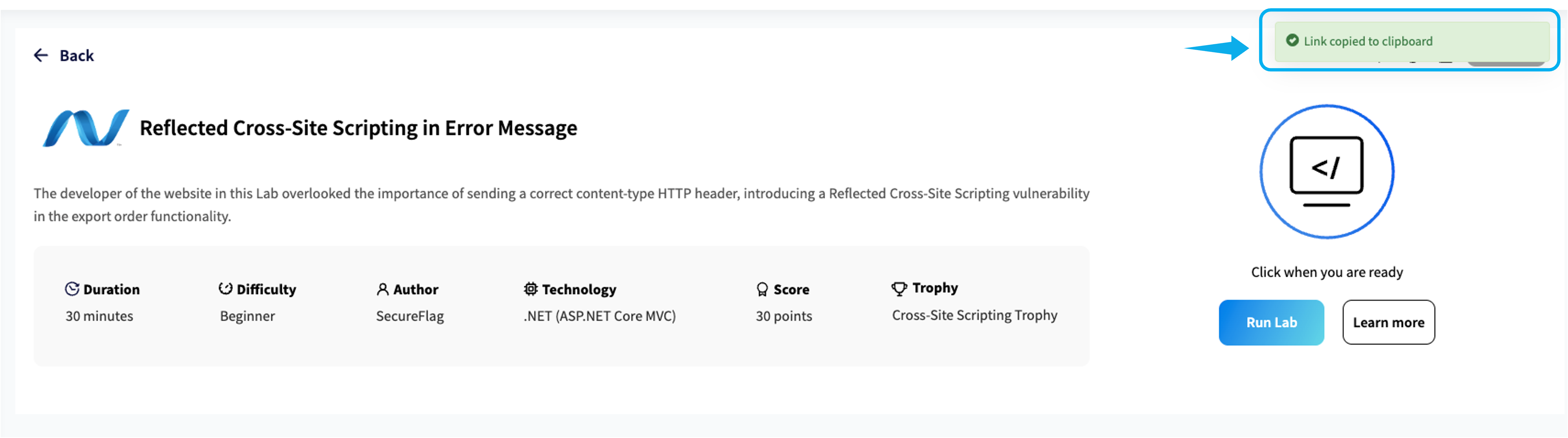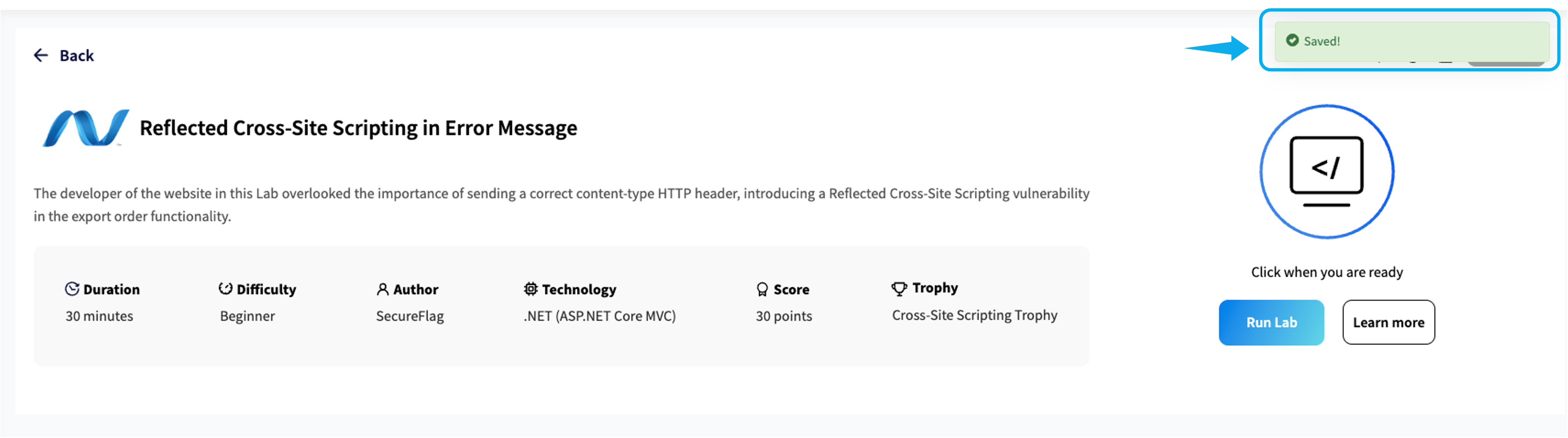 If your changes have fixed the vulnerability, the stage number changes from 4 to a Blue Tick, and a popup window will appear, indicating that you have successfully completed the Lab.