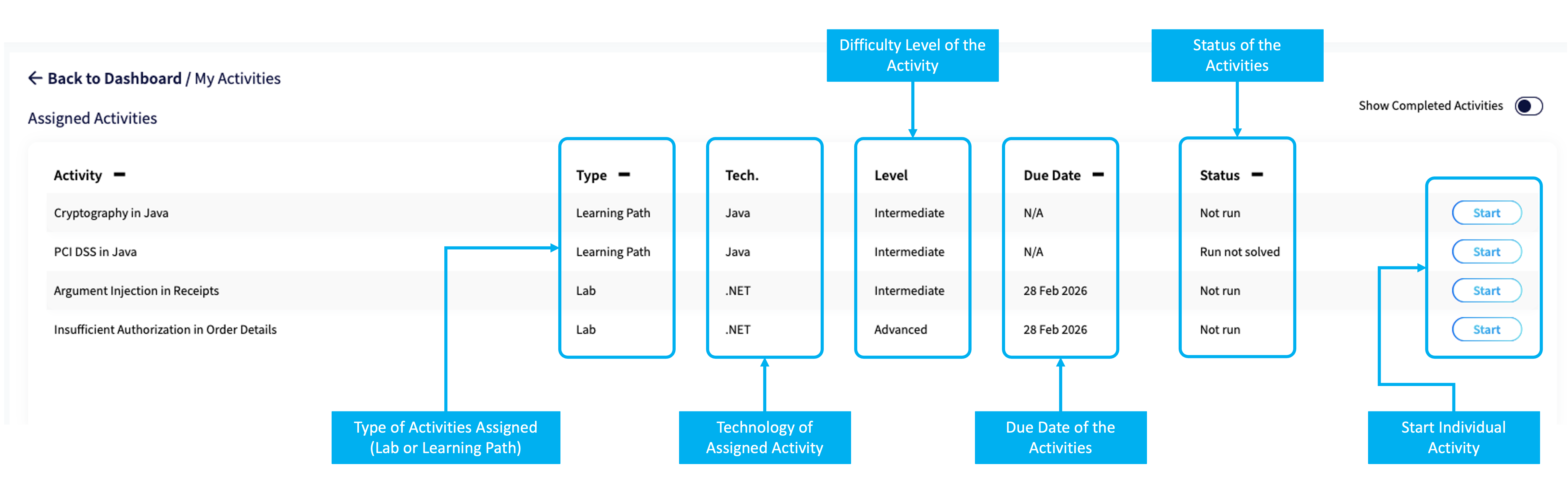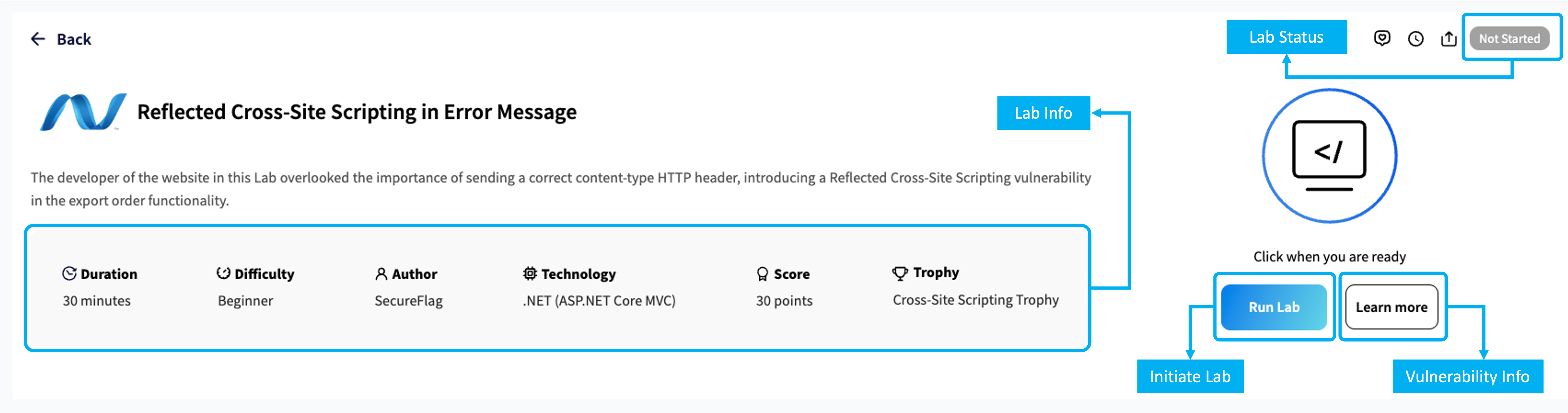 The first Scenario stage provides the description of the exercise, as well as its duration, difficulty level, and score.