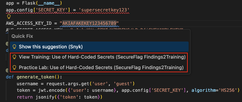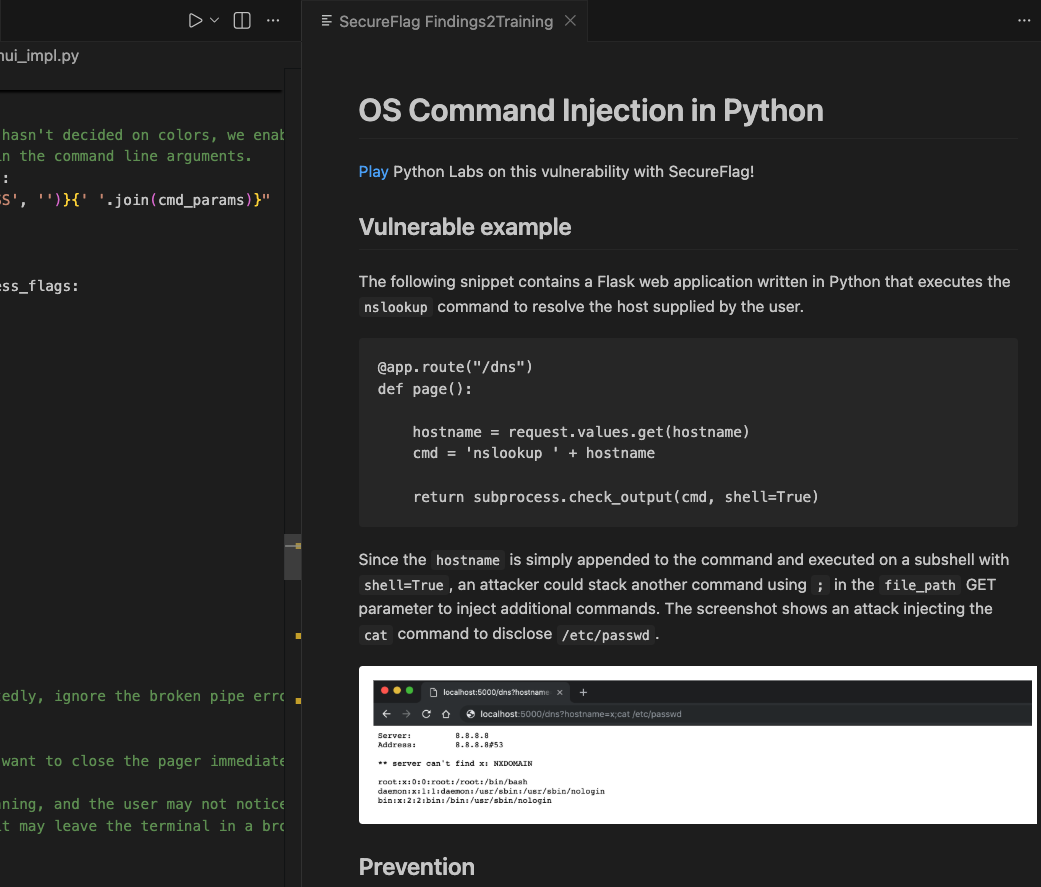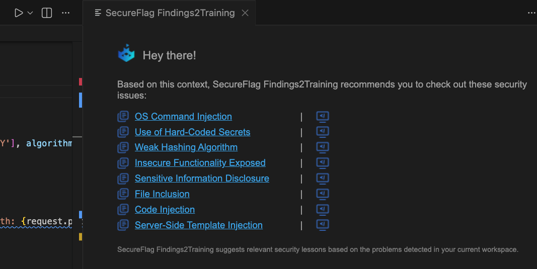 SecureFlag Findings2Training is a Visual Studio Code extension that watches for security issues in your code workspace and automatically recommends the right training articles and hands-on practice labs to help you understand and fix them.