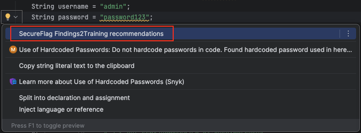 - The results appear directly in your editor as inline Quick Fix suggestions and in the SecureFlag Findings2Training tool window.
