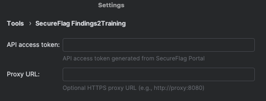 - If you're behind a corporate proxy, verify the proxy URL is correct in Settings → Tools → SecureFlag Findings2Training → Proxy URL.