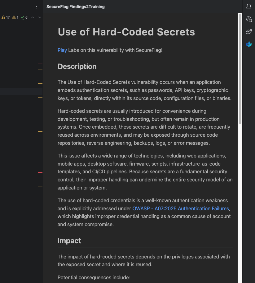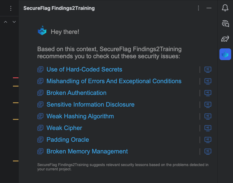 After the analysis finishes, the SecureFlag Findings2Training tool window will open on the right sidebar, listing all the security vulnerabilities found in your open files, along with links to relevant training and practice labs.