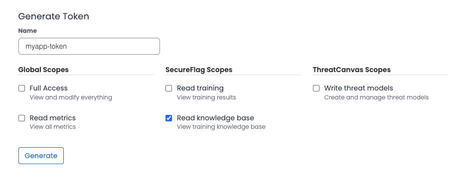 - From the API Access Tokens section, generate a token with either Read knowledge base or Full Access scopes.