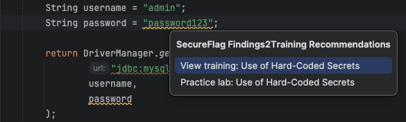 SecureFlag Findings2Training is an IntelliJ IDEA plugin that watches for security issues in your project and automatically recommends the relevant training articles and hands-on practice labs to help you understand and fix them.