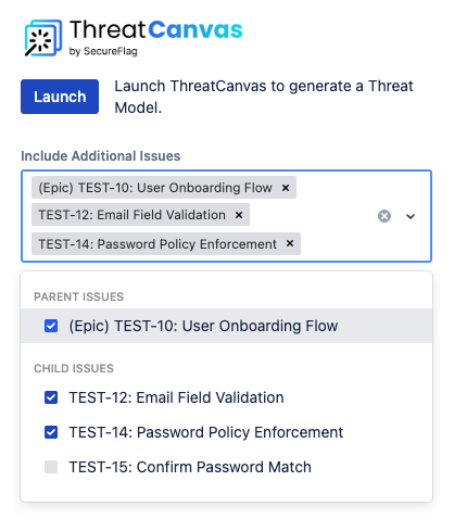 Users may optionally include the current issue’s parent or child issues in the ThreatCanvas context: