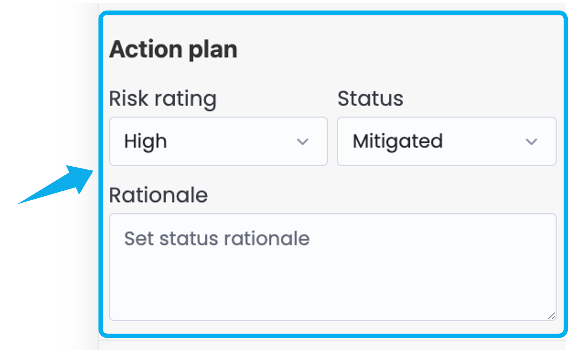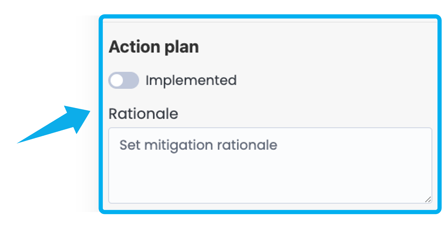 Below the control information, the Action Plan section allows you to mark the Control as implemented by toggling the provided switch and adding a mitigation rationale.