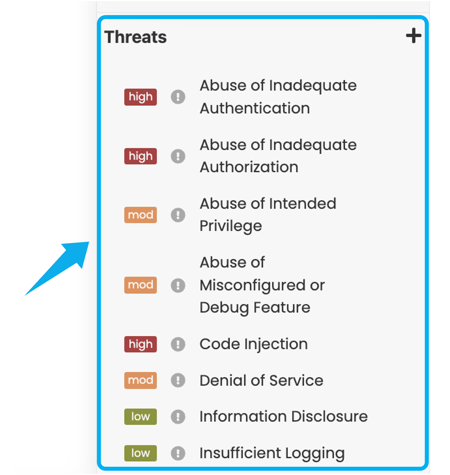 In the right-side menu under Threats, you can see the list of threats identified in your threat model. You can add new Threats to this menu, quickly change their Risk Rating and Mitigation status, or remove them entirely by clicking the Delete icon.