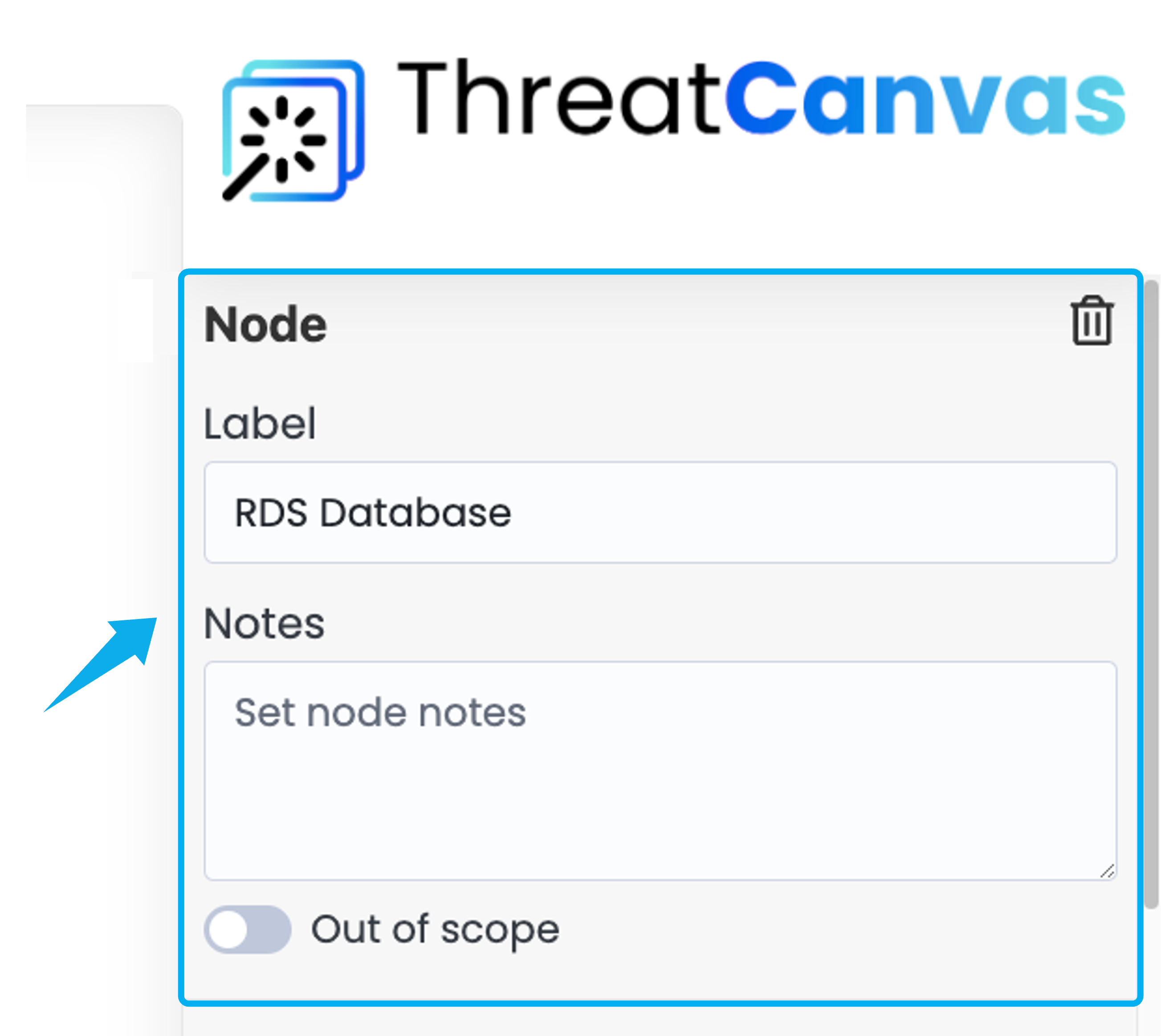 In this section, you can add labels to nodes, include notes, and mark nodes as out of scope by toggling the "Out of Scope" switch. Marking a node as out of scope will exclude it from the analysis and reports.