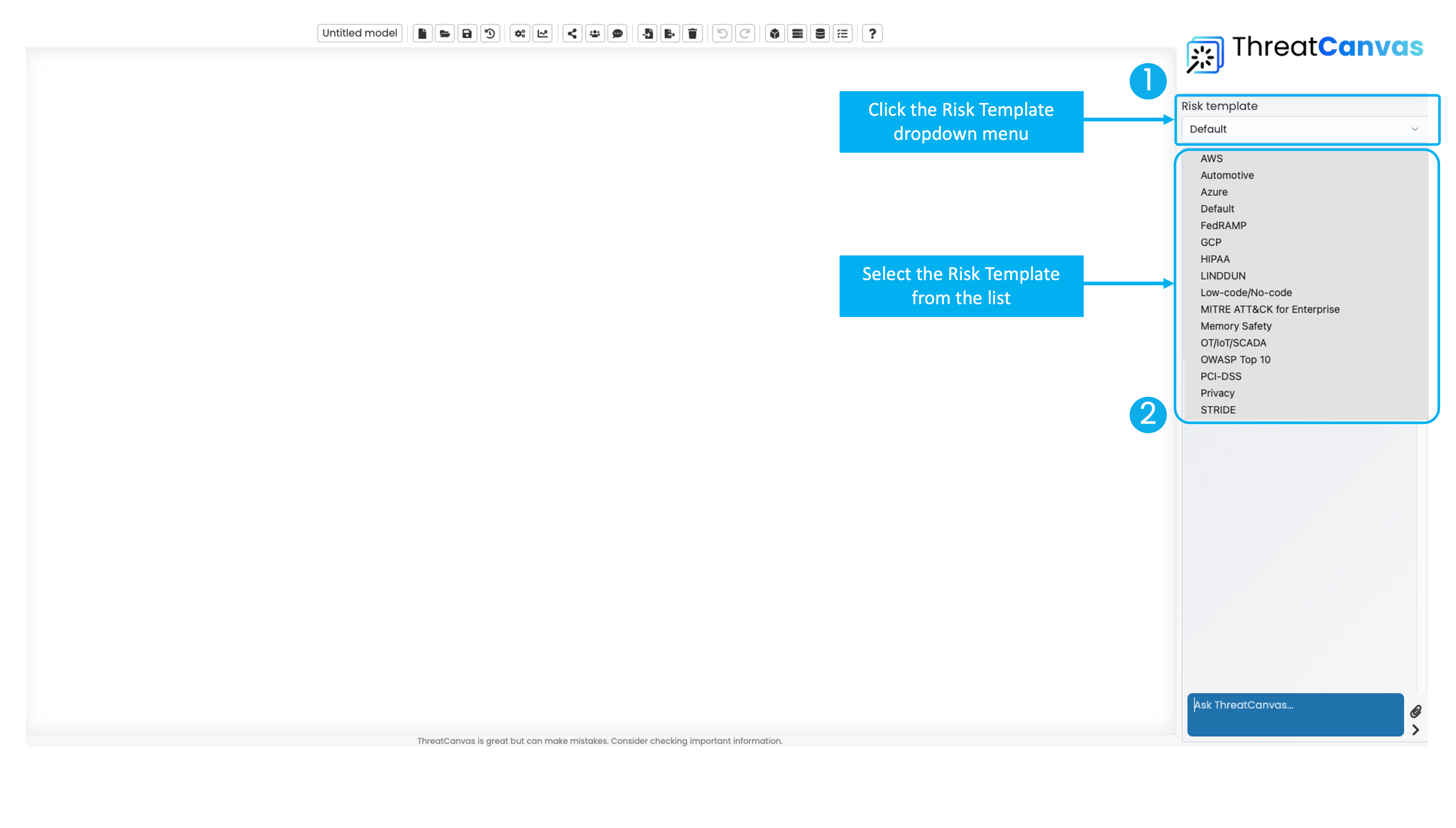 Risk Templates guide ThreatCanvas in focusing on specific risk areas, ensuring relevant and targeted threat identification. ThreatCanvas will use the chosen template to identify threats and their corresponding controls.