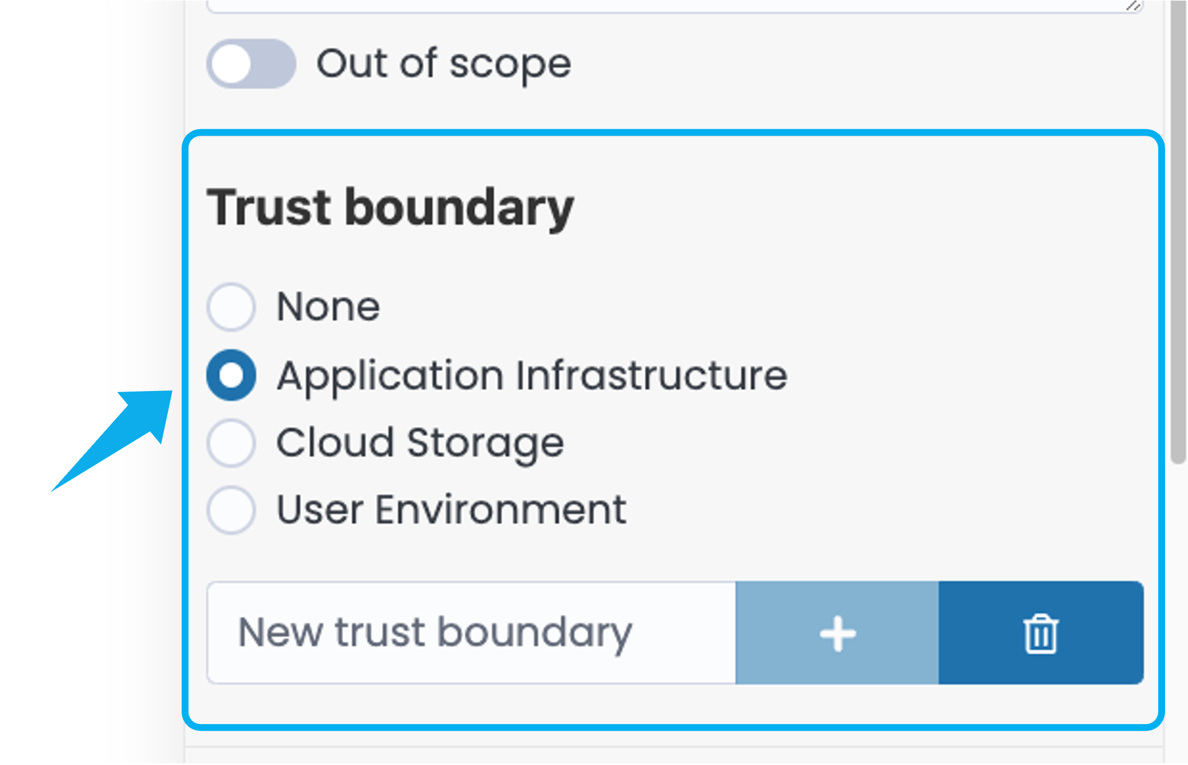 Trust Boundaries are points where the level of trust or control changes within the system. You can place a node into a Trust Boundary by selecting one of the available Trust Boundaries from the list. To create a new Trust Boundary, simply enter its name in the text box and click the plus (+) button. You can also delete existing Trust Boundaries by selecting one and clicking the Delete icon.