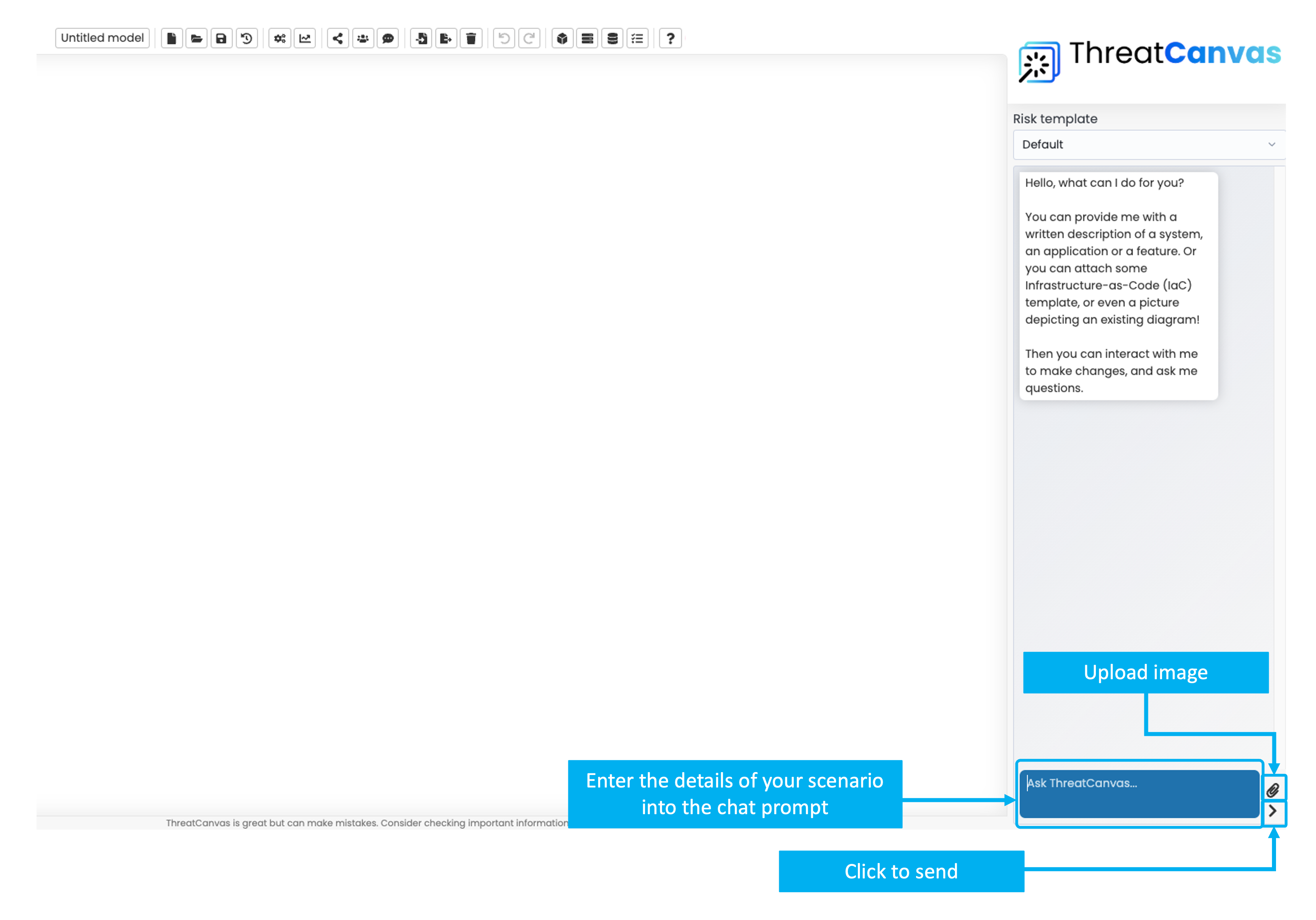 Start by entering the details of your scenario directly into the chat prompt. The more detailed your description, the better the analysis. You can also add more details and refine your analysis later by chatting with the ThreatCanvas Assistant.