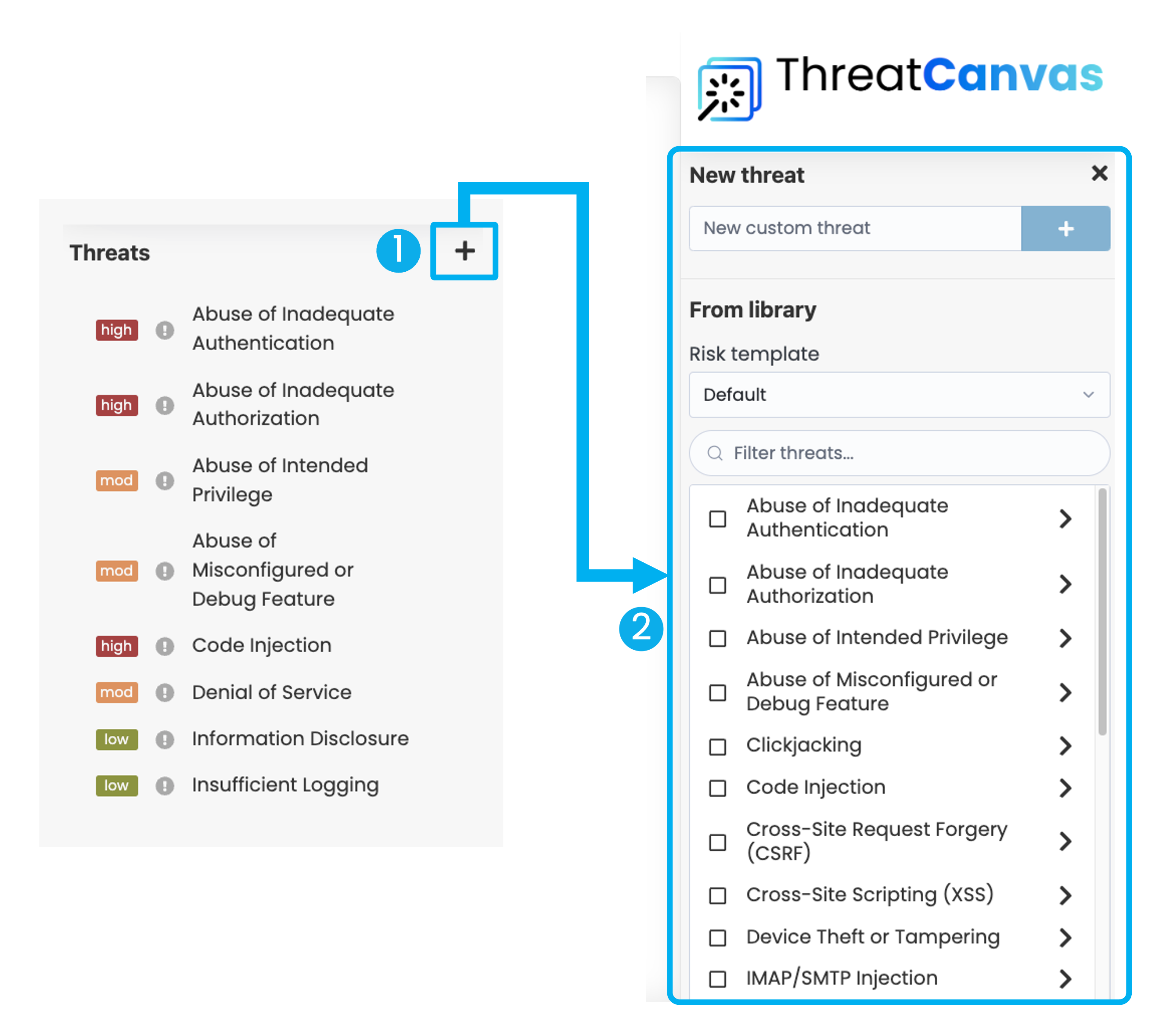 Select Threats from the library filtered by the available Risk Templates. Alternatively, add a custom Threat by giving it a name and clicking the '+'