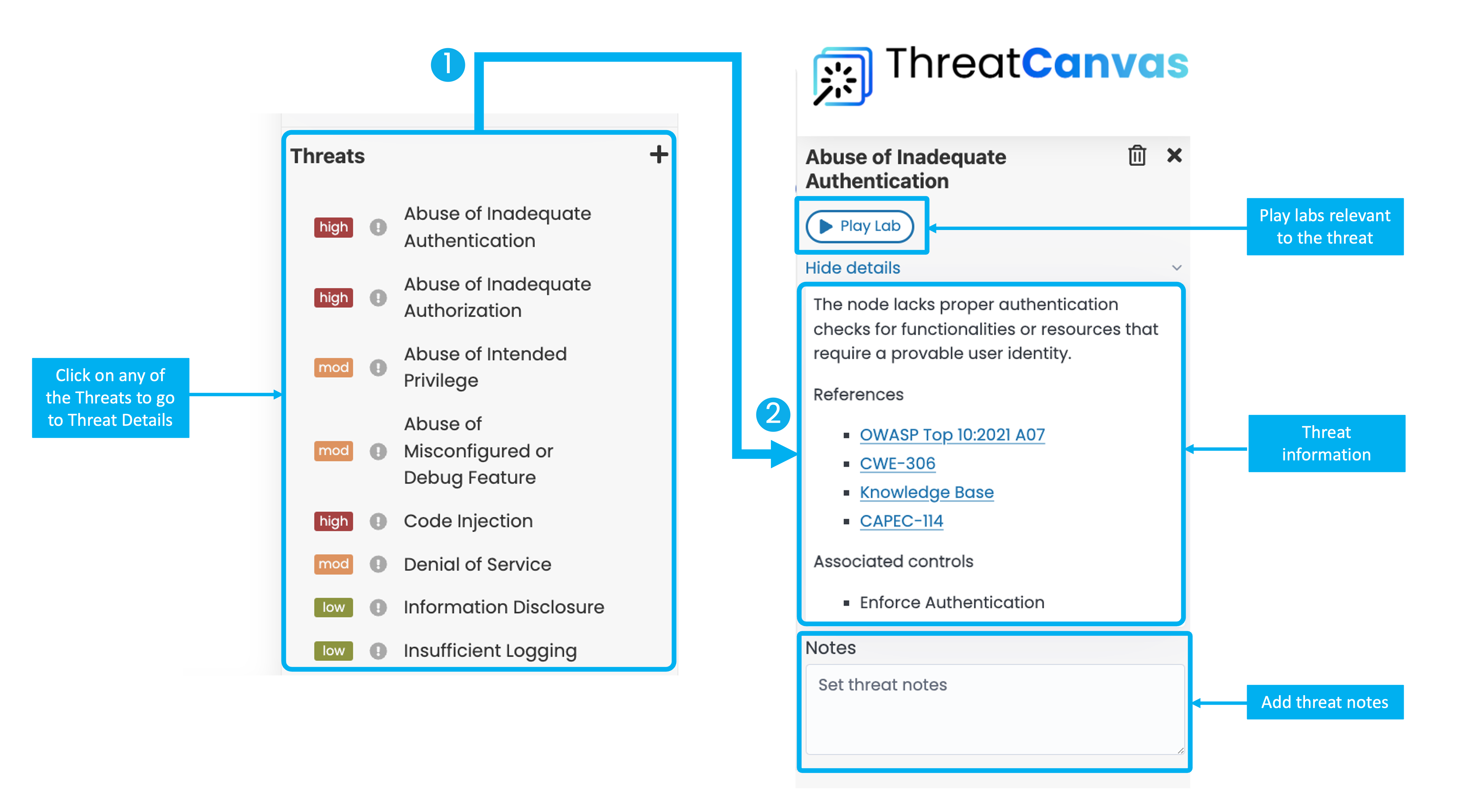 Click on Show details to access detailed information about the Threat from SecureFlag’s Knowledge Base as well as curated external sources. If you have a SecureFlag Training license, you can also play hands-on training labs relevant to the Threat. It’s also possible to add notes in the designated text box.