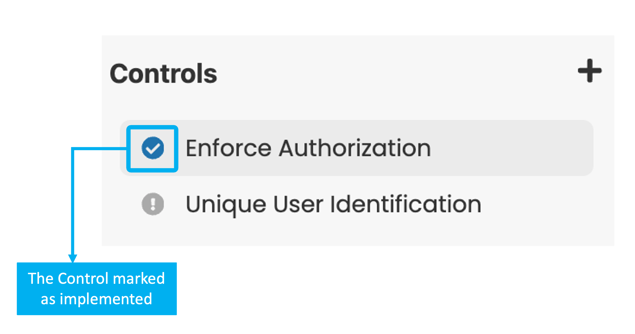 To mark a Control as implemented, click the small circle. Once the circle changes to a blue tick, the Control is marked as implemented. To delete a Control, click the Delete icon.
