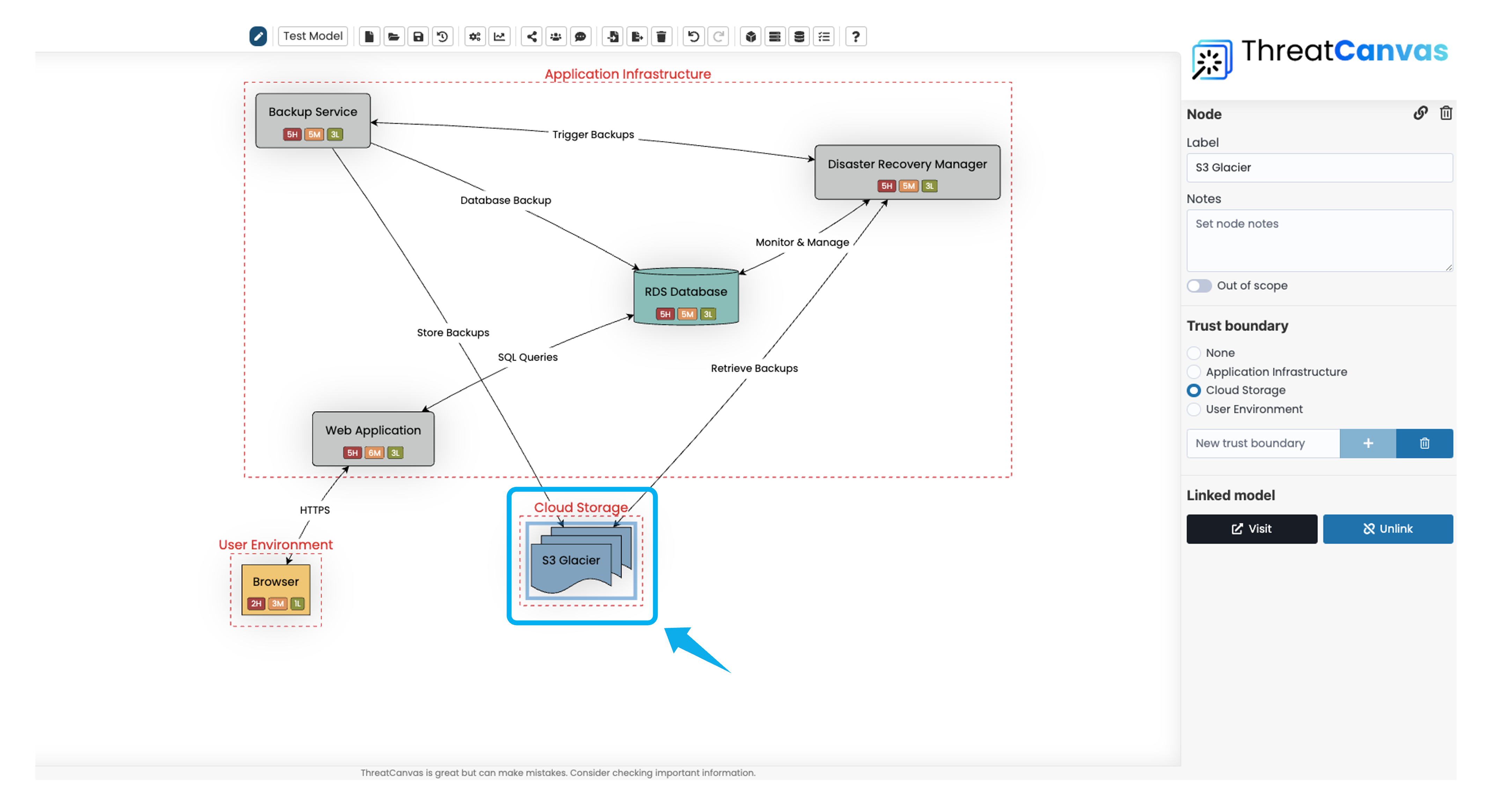 Trust Boundaries. For each node, ThreatCanvas identifies potential threats and their corresponding controls according to the selected Risk Template.